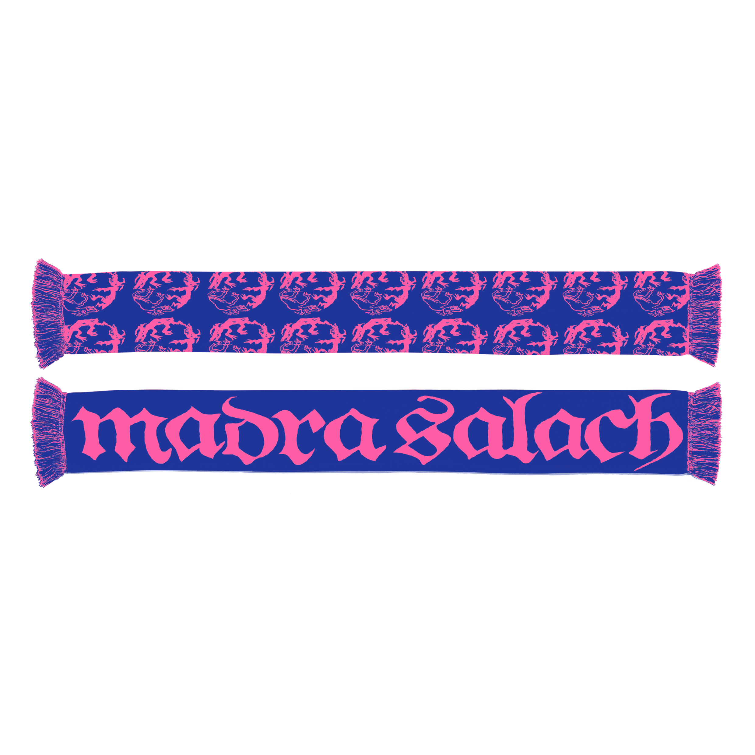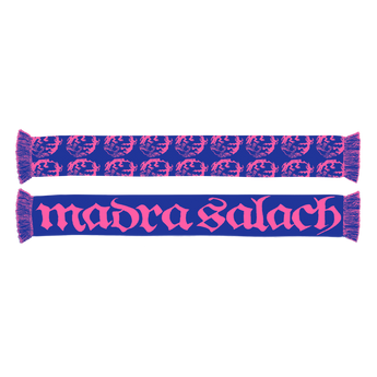 Store exclusive Madra Salach logo scarf in blue and pink.