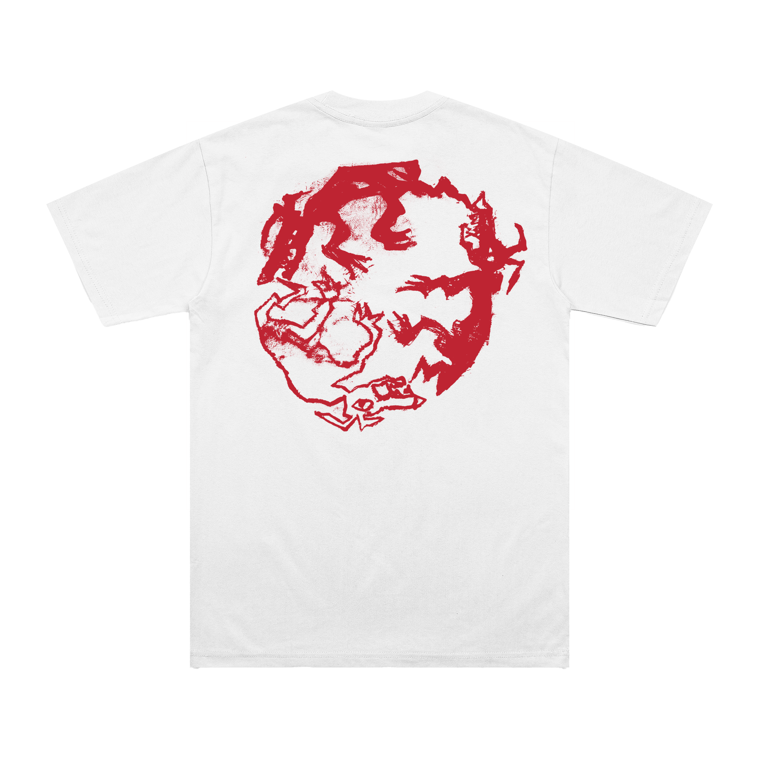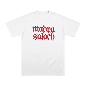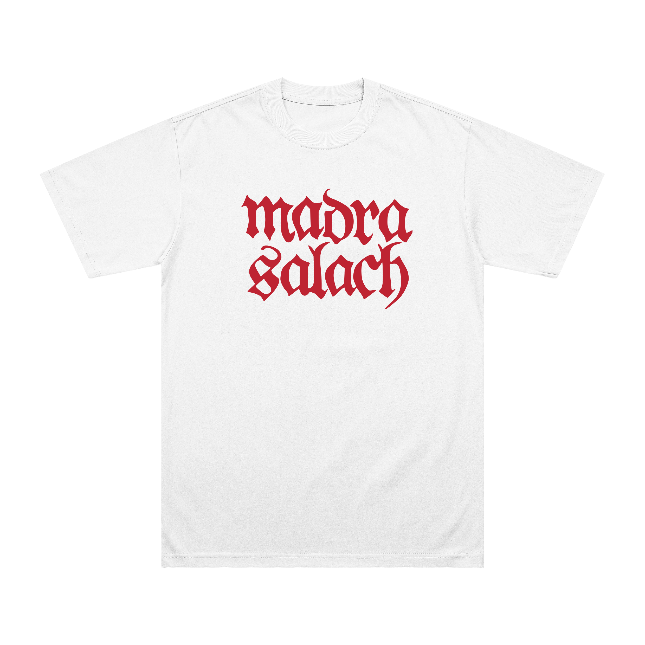 Store exclusive logo t-shirt in white with Madra Salach logo and design in red on both front and back.