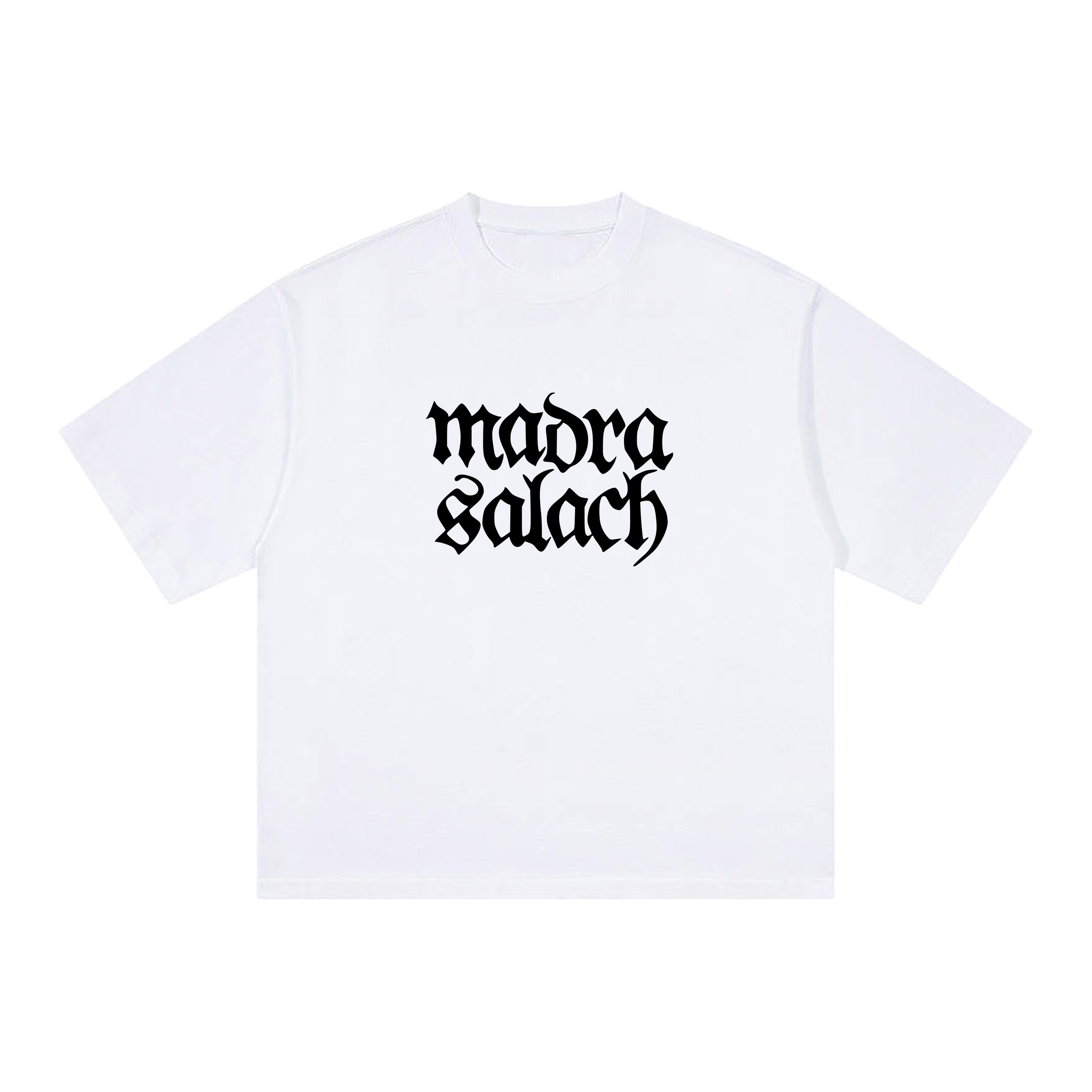Store exclusive logo t-shirt in white with Madra Salach logo and design in black on both front and back.